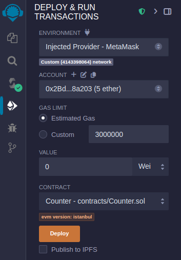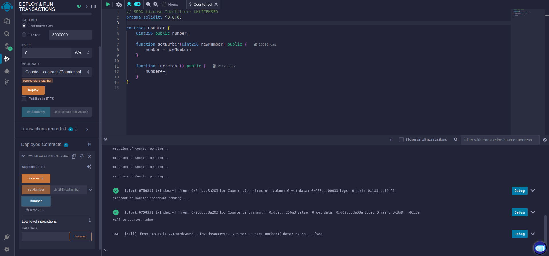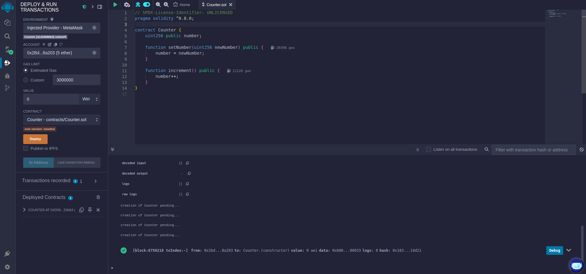 * Use the Remix interface to interact. For `Counter.sol`, click `deploy`. Confirm the transaction in Metamask.